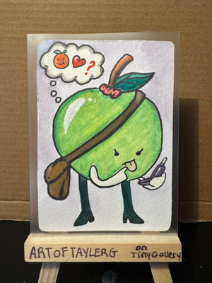 These cards have been bundled for Tiny Gallery Tuesday! Lumbricus Terrestris from "The Bug Collection" series, and An apples dilemma from the "Silly Little Guys" series PLUS a mystery card from my "Japan Junk" series! THATS 3 CARDS TOTAL! Each card is in a clear protective sleeve and the information for each piece is listed on the backside.