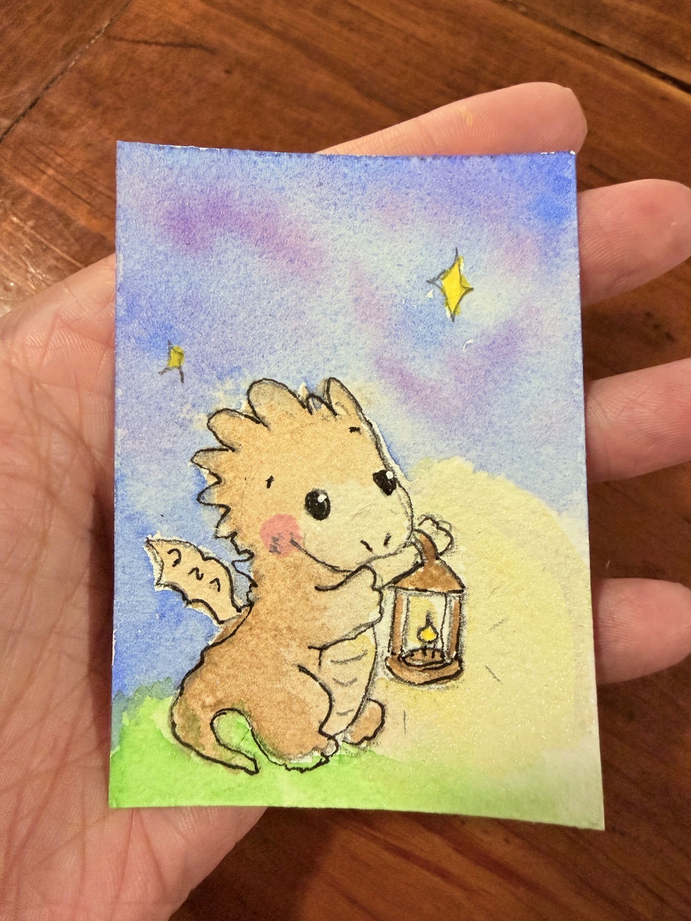 Meet Glowflame, the lantern dragon of Fluffletown. Each evening when the stars begin to appear, Glowflame climbs the lantern tower to light the guiding lantern. His job is to help the older dragons returning from faraway adventures find their way safely back home. He’s still a little nervous of the dark but every night he lifts his lantern anyway, learning that bravery can glow just as brightly as the light he carries. This is an original hand-painted ACEO Details: • Original watercolor and ink painting • Size: 2.5 x 3.5 inches (ACEO size) • Part of the Fluffletown dragon series Each dragon in Fluffletown has an important role in the village, and Glowflame’s light helps guide travelers safely home.