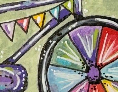 Sweet bike painting with colorful wheel and banners. This card comes from a 3 card series “enjoy the ride” It is #3 of 3. Happy Bike Painting Painted with Acrylics on heavy 190lb canvas paper. Signed and hand painted by Robin Conroy. Comes in protective sleeve