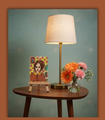 This small colored pencil artwork shows a young girl in a mid-century style room. I believe she is anticipating something important! Perhaps she is getting ready to go to her first job interview -- or maybe she is meeting someone special for lunch. She popped into my imagination and I draw her. My sense is that she is just about to embark on the beginning of an important life experience This is a mini-drawing (2-1/2 X 3-1/2 inches) done in colored pencil on illustration board. It is backed with an extra layer of card stock and signed and dated on the back by the artist (me). Size: Art is 2-1/2 X 3-1/2 inches. - ***Will be shipped with care in a protective sleeve and in a rigid mailer. Ships with first class stamp (no tracking to keep shipping costs low.)*** ***Art trading cards are a great fun to collect and display original art in an affordable way! Although I reserve the right to create prints of this picture in the future, this card is the one and only original.*** Note about colors: I try to get the color right but monitors and lighting can make color vary in appearance.