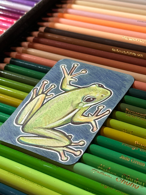 Original artist trading card measuring 2.5" x 3.5", featuring a drawing of a Green Frog. Created in the year 2026 :) The art is made from marker and color pencil and white gel pen to add finishing touches.