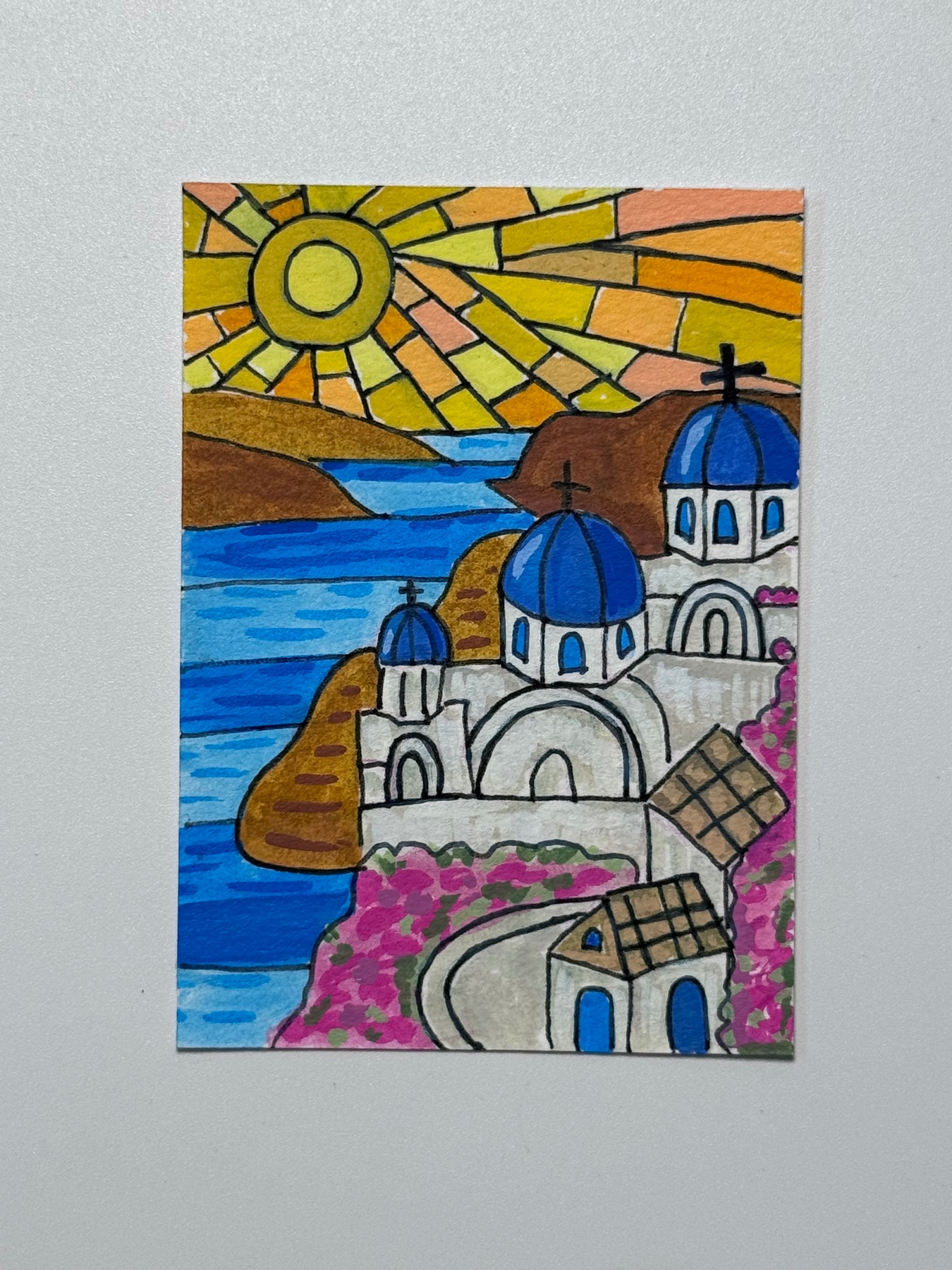The century Sun landscape is inspired by stained glass art. Made with acrylic and pen.