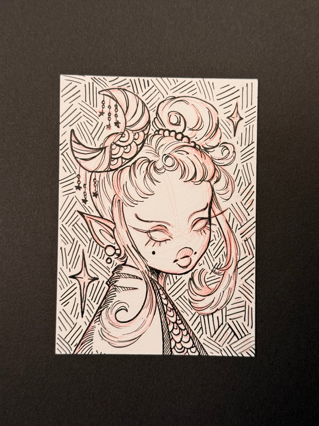 2.5” x 3.5” ACEO card comes in a protective sleeve Red pencil and Black ink on cardstock Card # 15