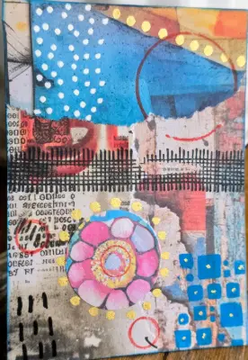 An original mixed media collage built from layered fragments of vintage paper, paint, and mark-making. A soft pink floral form sits at the center like a quiet focal point, surrounded by scattered gold dots and fields of bright blue. Torn edges, printed text, and graphic lines create contrast between structure and spontaneity. The piece has a balance of playful and thoughtful elements—polka dots, circles, and grids moving across the surface like small visual conversations. Every layer adds texture and history, giving the work a sense of movement and discovery the longer you look at it. Original artwork, one of a kind. Created with collage papers, acrylic, ink, and metallic accents. Small work, but full of detail and character—perfect for collectors of miniature contemporary collage.
