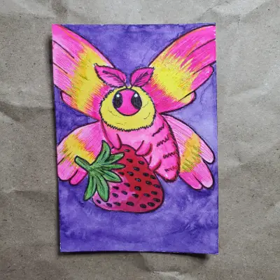 A rosy maple moth and strawberry illustrated with gel pen, micron pen, watercolor, and ink. Ships USPS First Class.