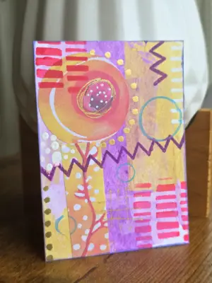 An original abstract mixed media miniature built with warm layers of coral, rose, lavender, and golden tones. A glowing central circle anchors the composition while zigzags, dots, and graphic marks create rhythm and movement across the surface. Metallic gold accents catch the light and add a subtle shimmer. The piece feels energetic, playful, and a little cosmic—like signals moving through color and space.