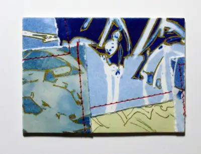 These two sewn collages started with simple photos of the grass and bushes growing outside my window. I printed them using cyanotype on Hahnemuhle Platinum Rag Paper, then drew around some of the elements with gold ink. I cut and tore the images into random sizes, then sewed then back together with red thread. These two are sold as a bundle and are titled and signed on the back; also the surface is covered in varnish. These were so much fun to make!