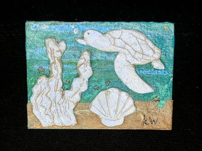 3 Dimensional Mixed Media: TURTLE & SHELL #C. Substrate: 140 lb Watercolor paper. Background: Blue, green, aqua & tan Acrylic inks on rice paper with small painted fish, and interference blue acrylic glaze. Foreground: Molded acrylic paste and paper turtle and shells with C.T. Interference violet-green glaze.