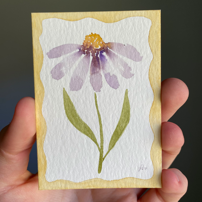 This little purple coneflower was inspired by the wildflowers I have seen around my area this spring. Featuring a cute yellow border to bring a little extra whimsy to this piece. A one of a kind watercolor ACEO, signed by the artist and dated.