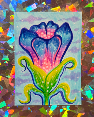 Original ACEO (2.5 x 3.5 inches) Watercolor and acrylic pen on Bristol. Signed, titled, and stamped on the back. Part of the ongoing “Fleur Céleste” series — luminous celestial flowers rendered in saturated color, cosmic glow, and winding organic forms. Each piece imagines a strange lil bloom from a dreamlike garden somewhere between starlight and hallucination. Created by Peyton, aka Unruly Patchouli. Packaged in a holographic sparkle star protective sleeve. Ships carefully protected via stamped snail mail.