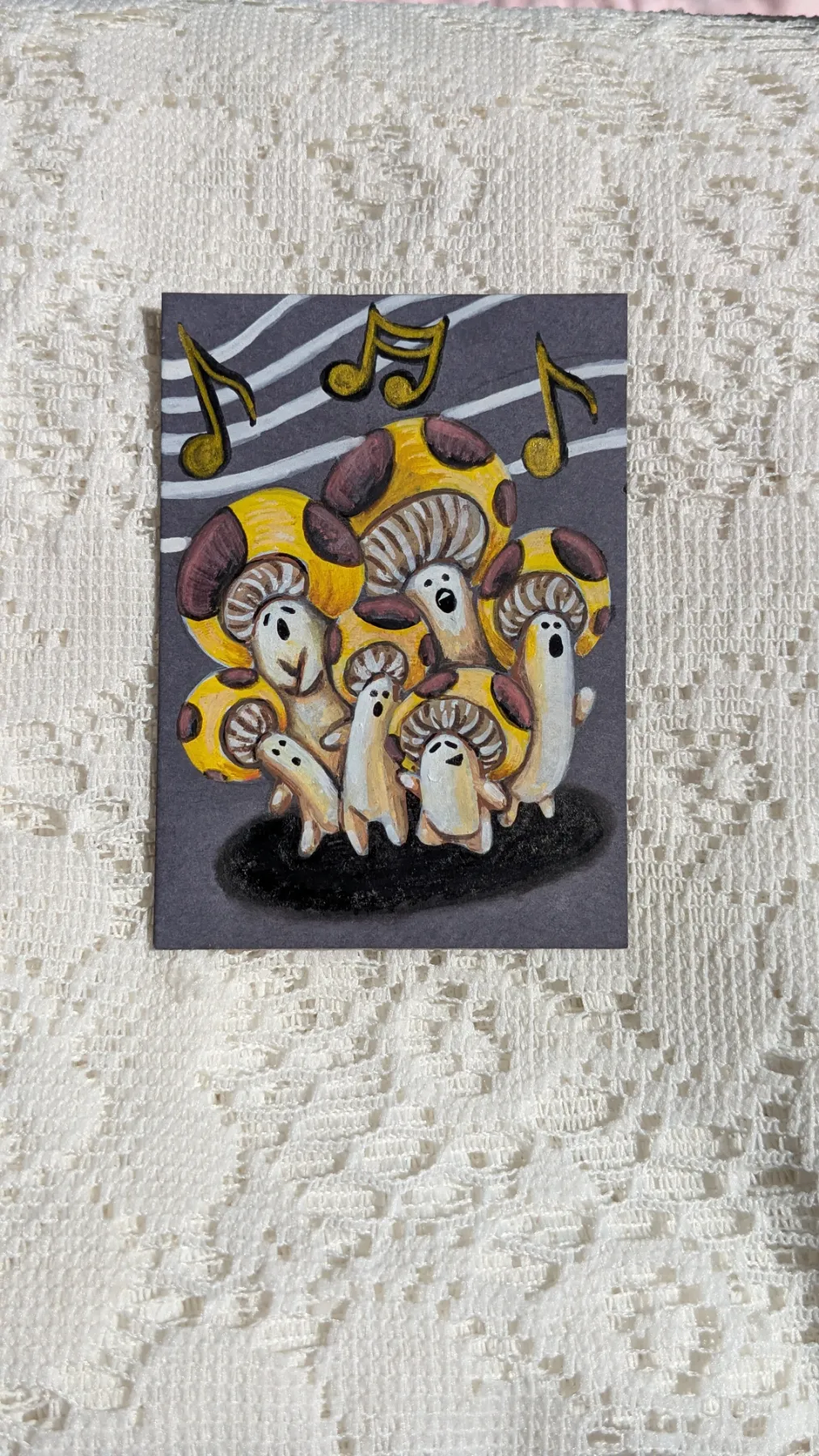 You come across a tiny patch of mushrooms in the forest and hear something strange... A tiny choir of mushrooms just below you singing a sweet little forest melody
