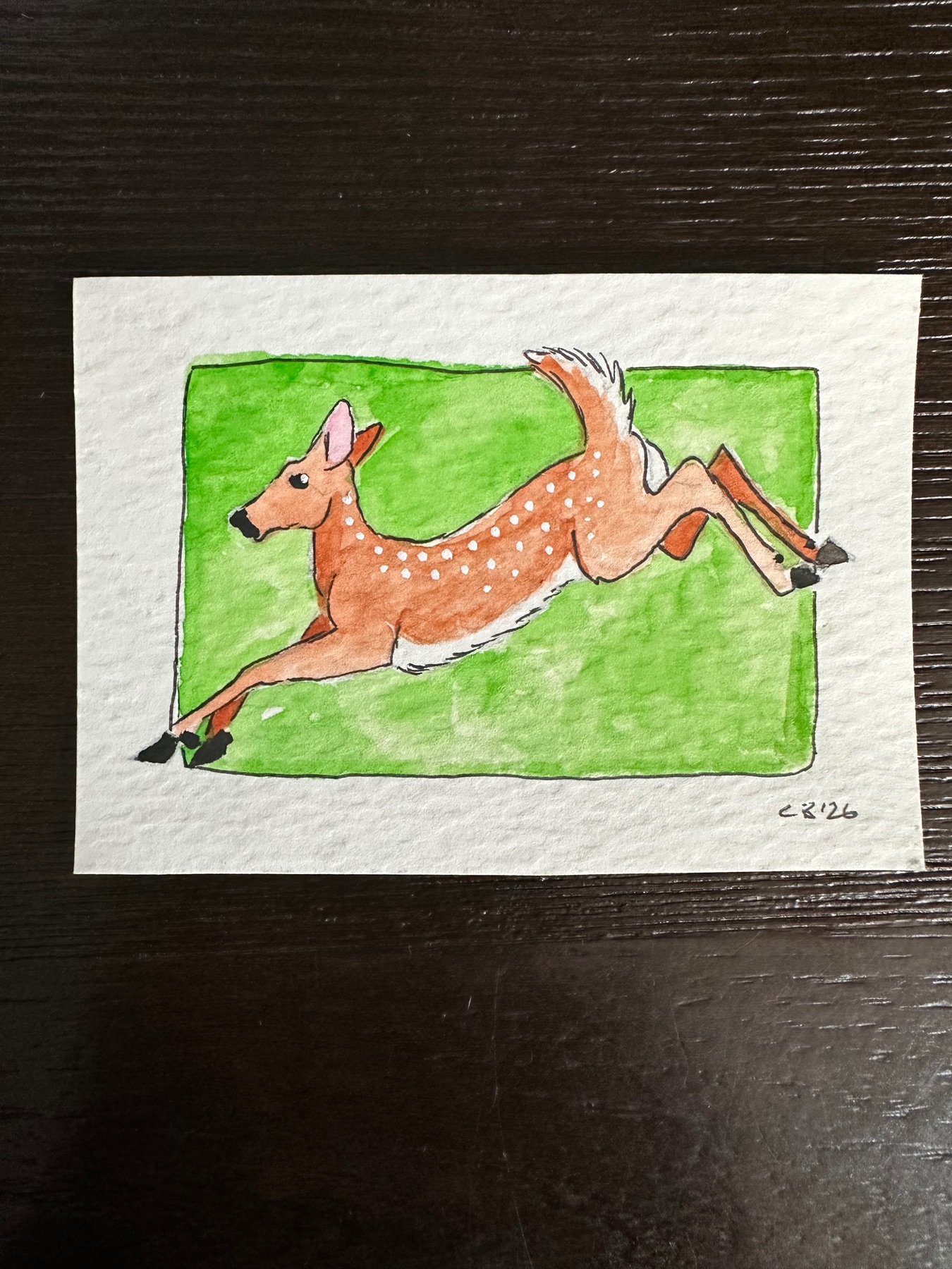 Hello! I absolutely adore deer and they look so majestic as they leap/jump (in my opinion). This little fawn is gliding through the air. . . And maybe into your collection? Watercolor and ink.