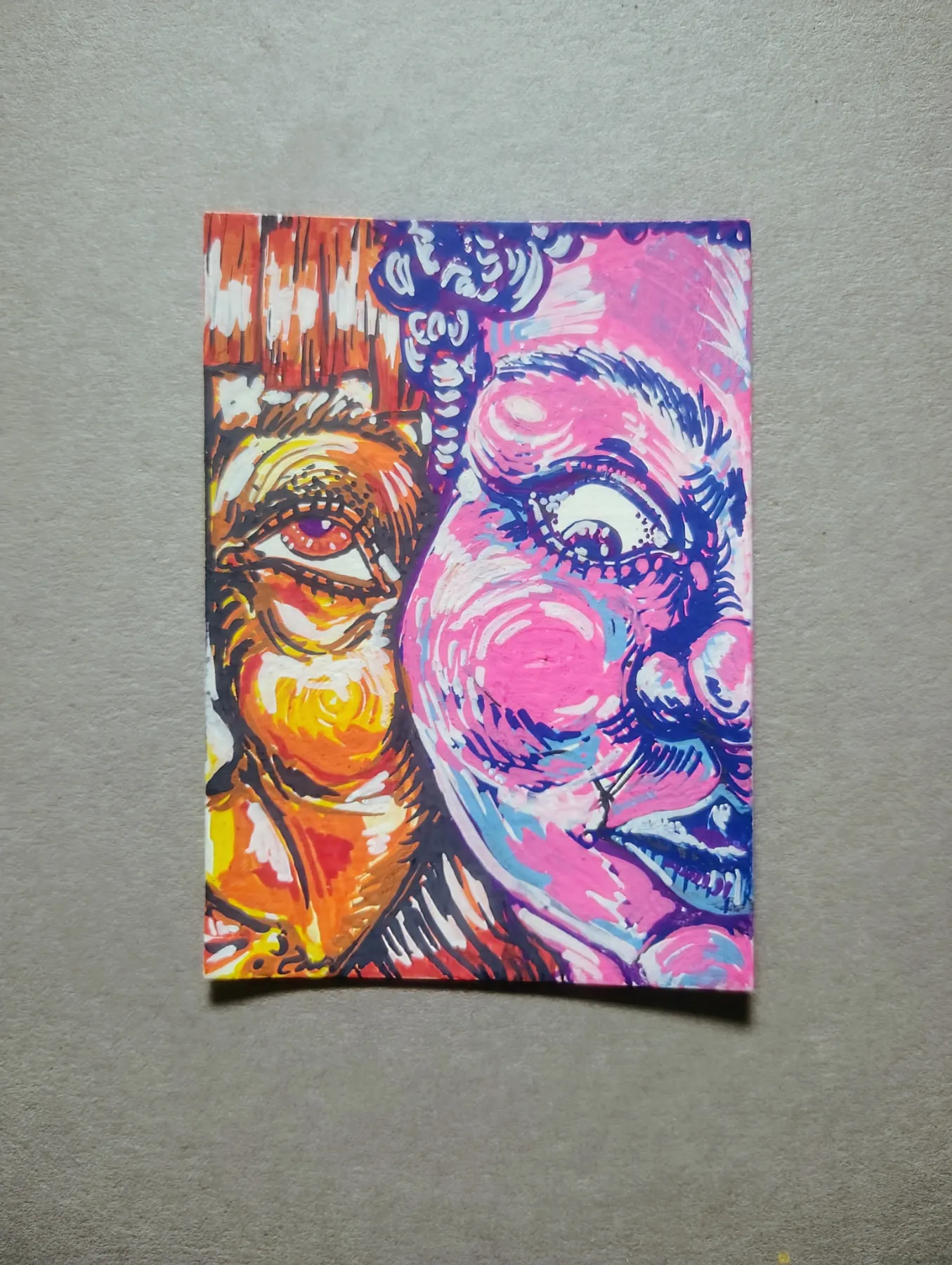 You know, when you squish in real close for that one frame? Have these two friends, may you have people you're willing to cram into a booth with This is, of course, a 2.5x3.5-in original one of a kind artwork, paint pens on Bristol. Also if you buy it, I'll wrap it up all nice for you 😘