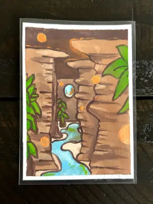 An underground river among rock structures Made with Acrylic 3.5''x2.5'' One-of-a-kind original Signed and dated on the back
