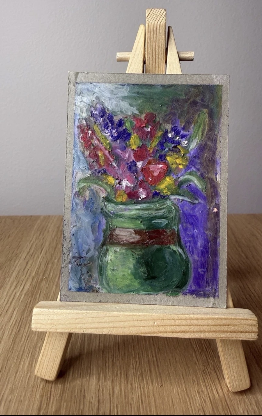 Lovely florals inspired by spring! I spray a fixative on all oil pastel pieces. 2.5x3.5” All ACEOs shipped via USPS in a stamped envelope