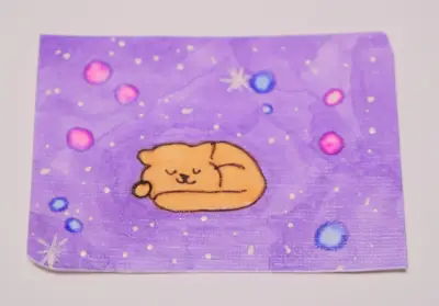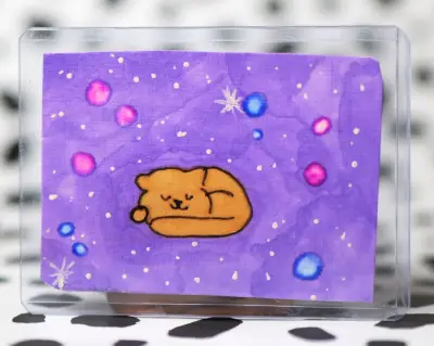 Soft, dreamy, and full of cosmic charm, “Space Cat #2” drifts between fantasy and comfort. This mixed‑media miniature by Kailyn Shaffer (2026) features a peacefully curled creature floating through a purple, star‑speckled sky, surrounded by glowing orbs and gentle color gradients. The hand‑painted textures and playful palette give the piece a warm, storybook feel — perfect for collectors who love tiny art with imagination, softness, and a touch of the surreal. It’s a calming little escape that brings a sense of wonder to any shelf or gallery wall.