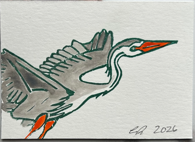 This series of minis is a study of a blue heron. A bird that can be found in every part of the country, I've seen them wild in every place I've lived. They always represented patience to me, standing quietly in shallow waters for hours. Each piece is printed and printed in ink and then hand-painted with watercolor individually, slight variations may naturally occur. 3.5 x 2.5, printed on 184lb acid free paper.