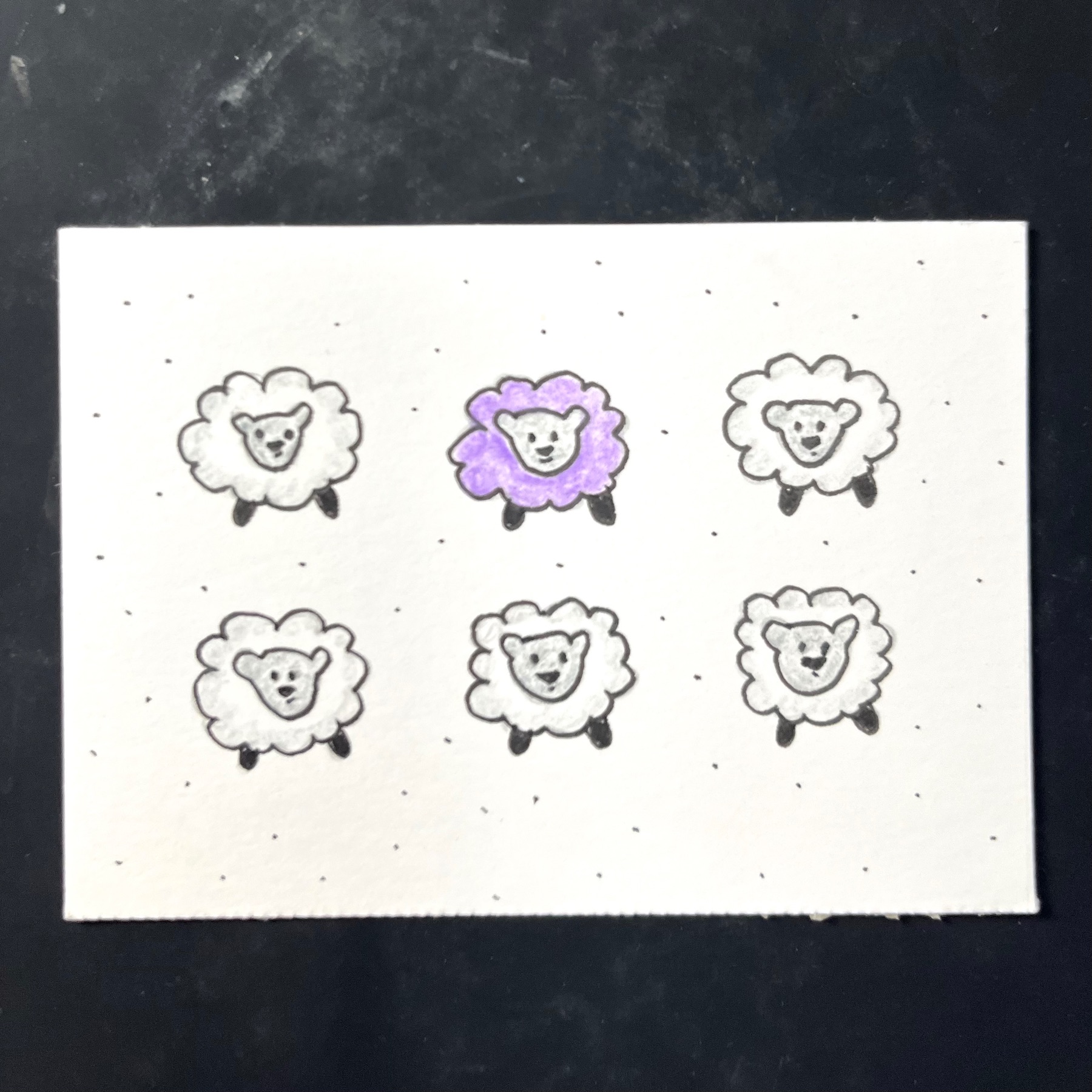 This is an original ACEO drawing by artist MMArt, featuring six cute sheep with one in purple- Be Ewe. The piece was done in colored pencil and ink medium. The artwork captures a unique ultra contemporary theme with an illustration art style, making it a one-of-a-kind piece. Signed by the artist and produced in 2026, this handmade drawing on paper measures 3.5 inches in length and 2.5 inches in width. Perfect for art enthusiasts and collectors, this mini art piece is sure to add a creative touch to any space. Please note that colors may vary slightly due to lighting & screen differences.