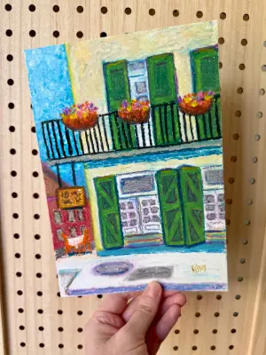 Went to a community photo club's event in New Orleans over the weekend and decided to draw this building across the street with my oil pastels. The Italian Barrel is close to the French Market and it was a beautiful day! Title: Italian Barrel – French Quarter This original oil pastel painting captures the vibrant charm of Italian Barrel in the heart of the French Quarter. Bright green shutters, wrought iron balcony railings, and overflowing flower boxes bring the façade to life, while a small café table hints at the intimate dining experience tucked inside. Expressive color and layered texture give the piece a lively, atmospheric quality—evoking the feeling of strolling through New Orleans on a warm afternoon. The composition highlights the architectural rhythm and character that make the Quarter so iconic. Perfect for collectors who love New Orleans, European-style architecture, or colorful street scenes. Details: • Original artwork • Size: 6" x 9" • Medium: Oil pastel on paper • One-of-a-kind original painting • Signed by the artist • Ships carefully protected