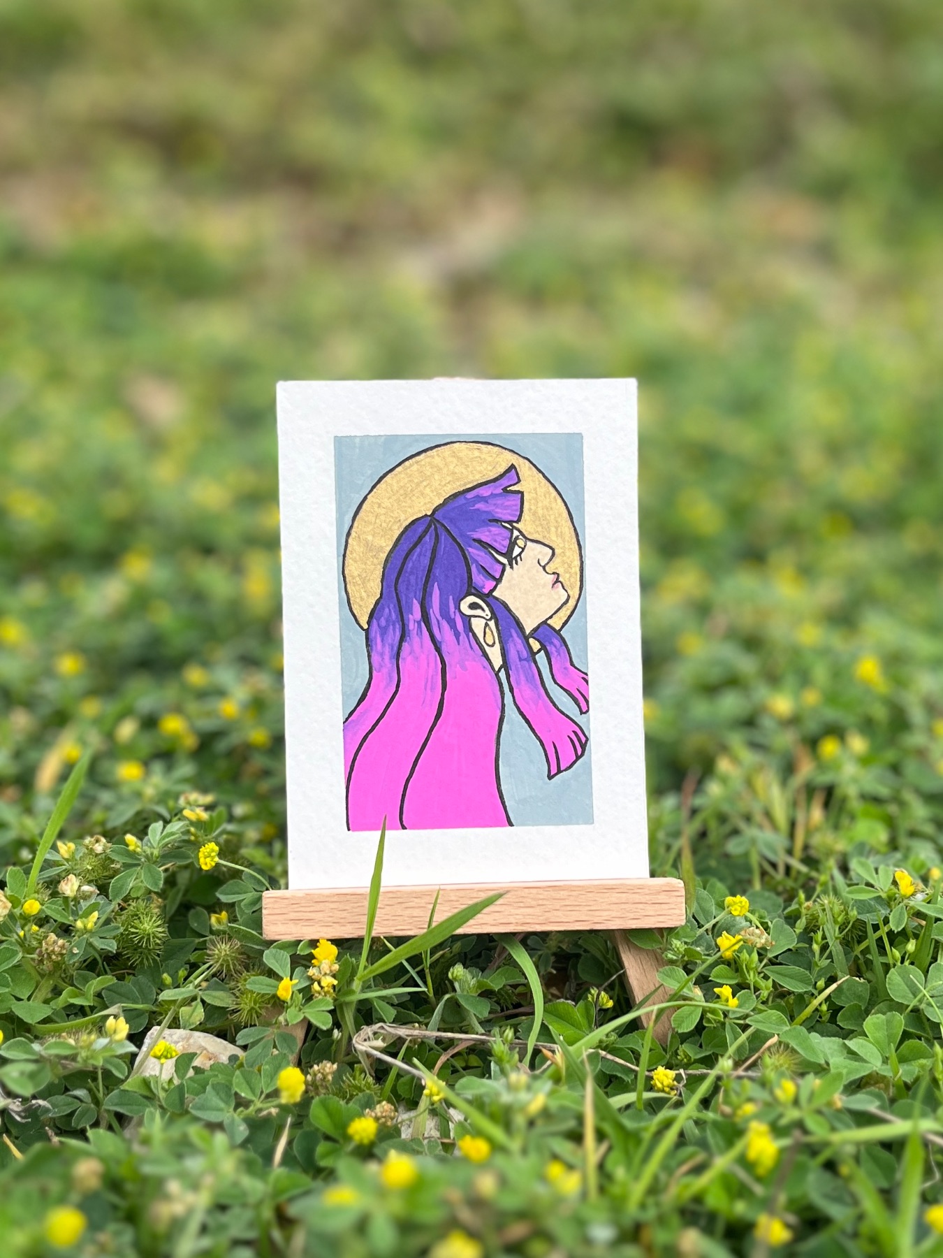 Original ACEO lightly inspired by art nouveau :) there are beautiful gold ink details on her earring, eye, and the halo around her head. I had so much fun making this piece; it felt like putting a friend on the paper. Done with acrylic marker, ink, Prismacolor and paint pen. Comes with protective sleeve.