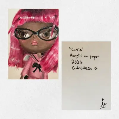 Original hand-painted ACEO. Portrait with bold pink hair, cat-eye glasses, and a little black bow. Acrylic on paper. 2.5" x 3.5". Hand-signed and dated on the back. Ships in a penny sleeve and rigid hard sleeve -Free shipping within the US.