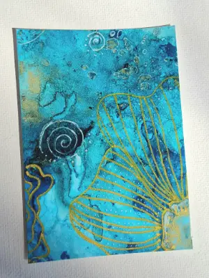 The Reef The Reef consists on 9 separate ACEO cards which were cut from a larger artwork. Created using alcohol inks and gel pen. Each card has been sealed with an acrylic topcoat to prevent smudging and protection. Will be sleeved, signed and numbered 1-9. Collect them all.... CHALLENGE If the same person purchases all 9 pieces, they'll receive a surprise additional artwork