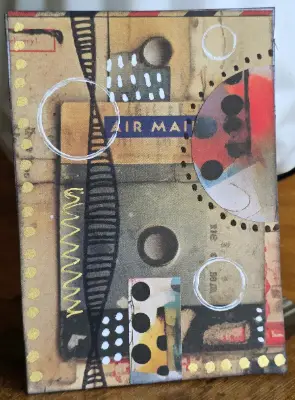 Mixed media abstract collage built from layered paper fragments, graphic marks, and subtle metallic accents. Circular forms and dotted pathways move across the surface like signals or routes on an old map, while the “Air Mail” element hints at travel, memory, and messages sent across distance. A small composition with a mid-century modern feel and lots of texture and visual movement.