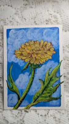 Dandelions have the amazing ability to grow in almost any type of dirt or soil with little to no nutrients. All while being stomped, sprayed, picked, or cut, she refuses to quit. She refuses to let anyone keep her down, as she keeps her face up to the sky, soaking up the sun, time and time again. Acrylic