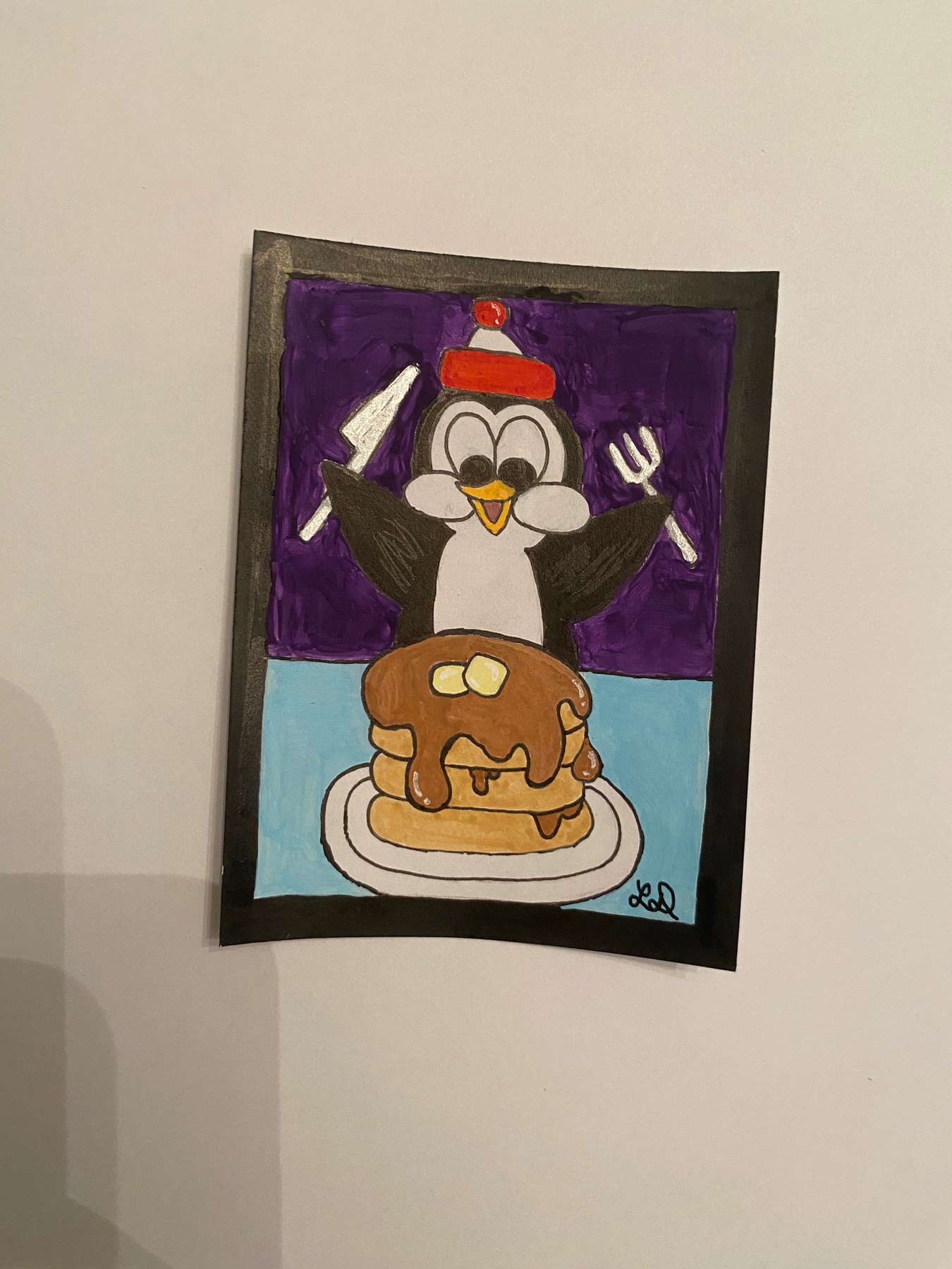 Here is the Chilly Willy penguin enjoying delicious pancakes! Dimensions of the piece: 2.75 width by 3.6 height in inches Artist: Lilli DePeppo Date: 2/21/26 Medium: Paganther Acrylic markers, gouache, Fabre Castell 0.3, and Gellyroll 05 white gel pen on Ohuhu double sided marker pad