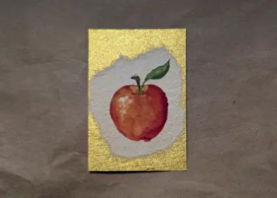 Hand Painted Fortune Apple on Calligraphy Paper - Gold Metallic Background | aceo art | TinyGallery
